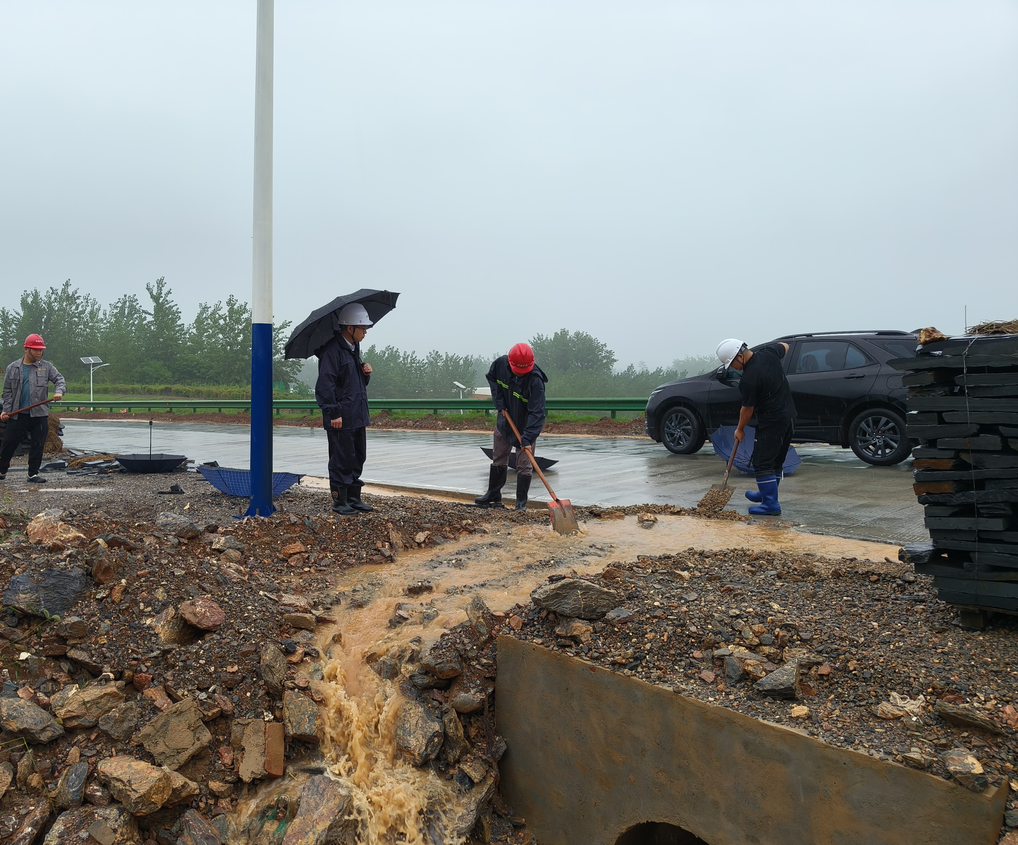 搶險(xiǎn)現(xiàn)場,黨員干部帶頭,通過沙包筑堤、開挖排水溝等措施進(jìn)行預(yù)防,同時(shí)對(duì)礦區(qū)、加工區(qū)開展全面隱患排查。中午,水塘漫堤隱患消除。