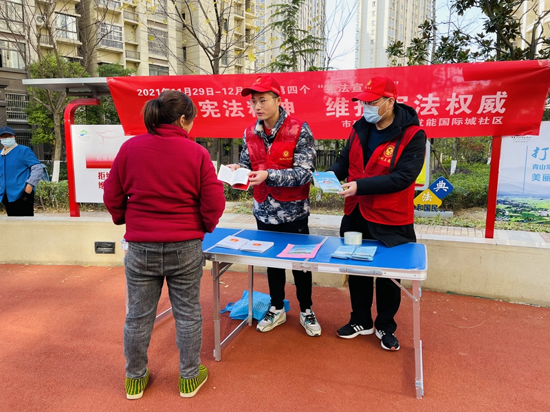今年的憲法宣傳主題為“以習(xí)近平法治思想為指引,堅定不移走中國特色社會主義法治道路”。在社區(qū)法治小廣場,志愿者向居民發(fā)放憲法宣傳手冊,講解國家憲法的由來、地位、主要內(nèi)容以及學(xué)習(xí)宣傳憲法的重要意義。